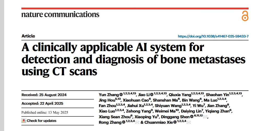 近日,由湘雅医学院附属肿瘤医院于小平教授团队的侯静教授作为共同第一作者在柳叶刀子刊《NATURE COMMUNICATIONS》(中科院一区,2024IF=15.7)发表了题为“A clinically applicable AI system for detection and diagnosis of bone metastases using CT scans(基于CT扫描检测和诊断骨转移的一种临床应用的人工智能系统)”的原创性研究论文。