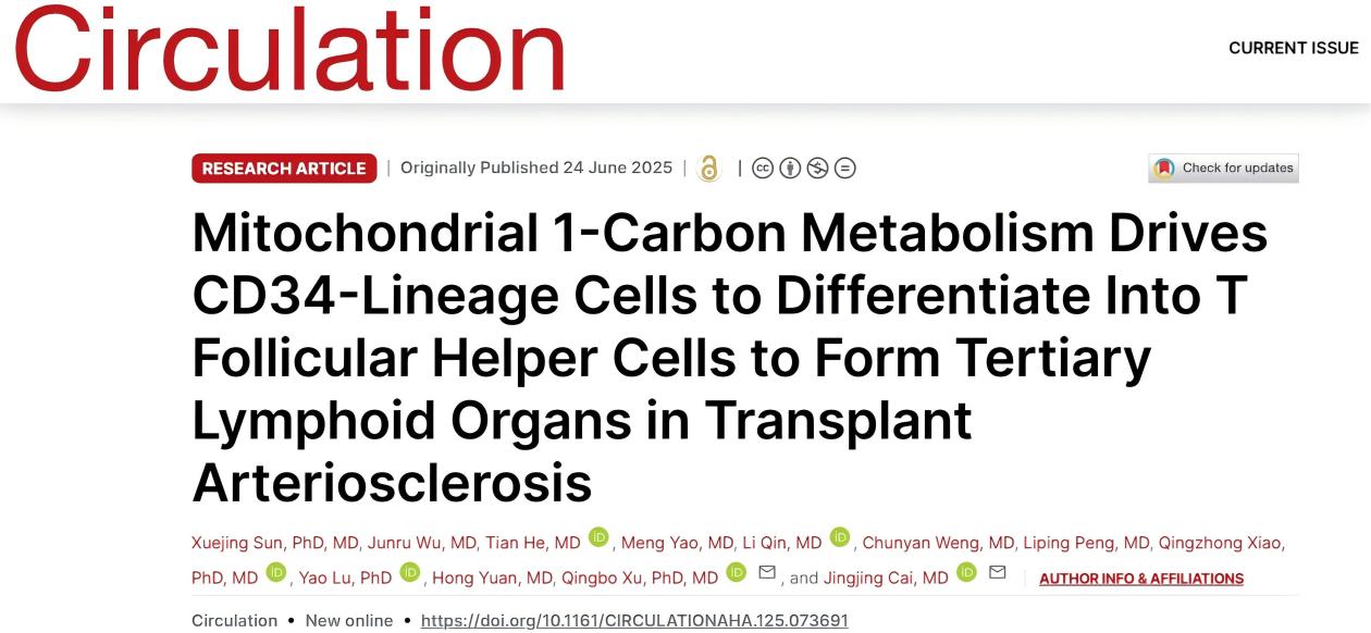 近日,中南大学湘雅三医院心血管内科研究员、湖南省心血管疾病研究中心主任蔡菁菁教授团队联合浙江大学徐清波教授团队在心血管顶刊Circulation(循环,IF=38.6)上发表题为“Mitochondrial 1-Carbon Metabolism Drives CD34 Lineage Cells to Differentiate into Tfh Cells to Form Tertiary Lymphoid Organ in Transplant Arteriosclerosis(线粒体一碳代谢驱动CD34谱系细胞分化为Tfh细胞促进移植血管重构中三级淋巴器官形成)”的原创性研究论文。