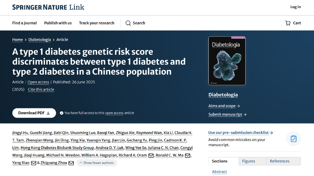 近日,中南大学湘雅二医院代谢内分泌科周智广教授、肖扬教授团队联合香港中文大学马青云教授、英国埃克塞特大学Richard Oram教授,在欧洲糖尿病学会会刊《Diabetologia》(IF:10)在线发表原创性研究论文,首次构建适用于中国人群的1型糖尿病遗传风险评分模型(CGRS),为糖尿病的精准分型诊断提供了全新工具。