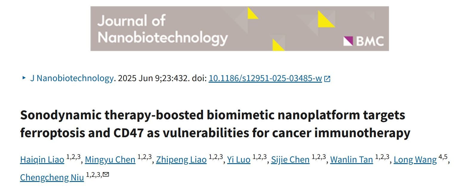 近日,中南大学湘雅二医院超声科牛诚诚教授团队在国际期刊《Journal of Nanobiotechnology》(中科院一区,影响因子12.1)发表题为 “Sonodynamic therapyboosted biomimetic nanoplatform targets ferroptosis and CD47 as vulnerabilities for cancer immunotherapy” 的原创研究论文。