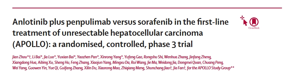 近日,湘雅医学院附属肿瘤医院罗嘉教授作为共同第一作者在国际顶级医学期刊《Lancet Oncology》(中科院一区,2024IF=35.9)上发表了题为“Anlotinib plus penpulimab versus sorafenib in the frst-inetreatment of unresectable hepatocellular carcinoma(APOLL0): a randomised,controlled, phase 3 trial(靶向药物联合免疫治疗组对比对照组一线治疗不可切除肝细胞癌(APOLLO):一项随机、对照、III期研究)”的原创性研究论文。