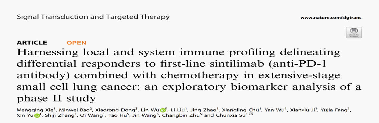 近日,湘雅医学院附属肿瘤医院邬麟教授作为共同第一作者,在Nature子刊《Signal Transduction and Targeted Therapy》(中科院一区,2024IF= 52.7)上发表了一篇题为“Harnessing local and system immune profiling delineating differential responders to first-line sintilimab (anti-PD-1 antibody) combined with chemotherapy in extensive-stage small cell lung cancer: an exploratory biomarker analysis of a phase II study(利用局部和系统免疫特征来分析广泛期小细胞肺癌中一线信迪利单抗(抗PD-1抗体)联合化疗的不同反应者:II期研究的探索性生物标志物分析)”的原创性研究论文。