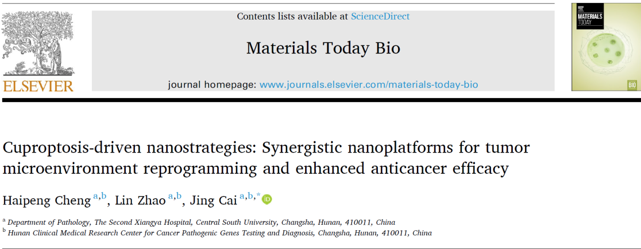 近日,中南大学湘雅二医院病理科蔡晶团队在国际生物材料期刊《Materials Today Bio》(IF=10.2,中科院1区TOP期刊)上发表重要综述论文《Cuproptosis-driven nanostrategies: Synergistic nanoplatforms for tumor microenvironment reprogramming and enhanced anticancer efficacy》。该研究系统构建了“铜死亡-纳米材料”协同理论框架,为克服恶性肿瘤耐药性及重塑免疫抑制微环境提供了创新策略。