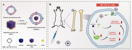传统骨质疏松症治疗多聚焦于抑制破骨细胞活性,却无法解决成骨细胞功能受损的核心问题。研究团队从神经损伤患者常并发骨质疏松、骨折愈合延迟等临床现象切入,结合神经-骨骼系统交互作用的前沿理论,首次证实神经生长因子(NGF)在骨质疏松症中的关键作用。但作为大分子蛋白,NGF的体内半衰期短、生物利用度低,其临床应用受到限制。为此,研究团队通过纳米技术实现NGF的剂型改良,成功开发出负载NGF的仿生普鲁士蓝纳米药物(MPDN),为骨质疏松症治疗开辟新路径。