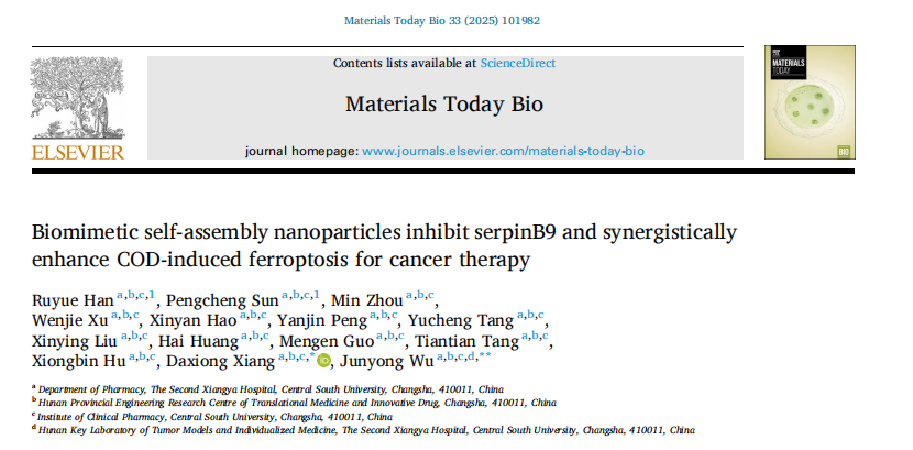 近日,中南大学湘雅二医院药学部、湖南省转化医学与创新药物工程技术研究中心向大雄教授与吴军勇副研究员团队在肿瘤协同免疫治疗领域取得新进展。研究成果以《Biomimetic self-assembly nanoparticles inhibit serpinB9 and synergistically enhance COD-induced ferroptosis for cancer therapy》为题,在国际学术期刊《Materials Today Bio》上发表。