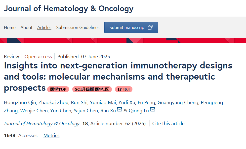 近日,中南大学湘雅二医院药学部鲁琼教授和泌尿外科徐冉教授课题组在Journal of Hematology & Oncology杂志(中科院一区TOP,影响因子40.4)在线发表了题为“Insights into next-generation immunotherapy designs and tools: molecular mechanisms and therapeutic prospects”的论文。