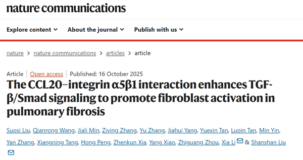 近日,中南大学湘雅二医院代谢内分泌科李霞、刘姗姗教授课题组在国际著名综合类期刊《自然通讯》(Nature Communications)(IF=15.7)以论著形式发表了题为《CCL20-整合素α5β1相互作用增强TGF-β/Smad信号传导,促进肺纤维化中成纤维细胞的活化》(The CCL20-integrinα5β1 interaction enhances TGF-β/Smad signaling to promote fibroblast activation in pulmonary fibrosis)的原创性论著。该研究系统揭示了趋化因子CCL20在肺纤维化发病过程中的关键作用。