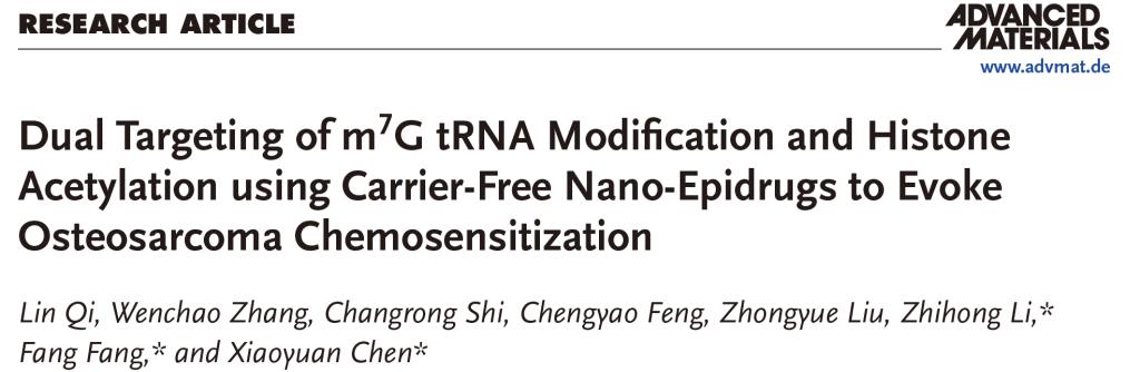 近日,中南大学湘雅二医院骨科黎志宏教授团队联合新加坡国立大学在国际权威学术期刊《先进材料》(Advanced Materials,中科院一区Top期刊,自然指数期刊,影响因子26.8)发表题为“双靶向m7G tRNA修饰与组蛋白乙酰化的无载体纳米表观药物增敏骨肉瘤化疗”(Dual Targeting of m7G tRNA Modification and Histone Acetylation using Carrier-Free Nano-Epidrugs to Evoke Osteosarcoma Chemosensitization)的原创研究论文。
