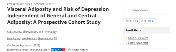 近日,中南大学湘雅二医院急诊医学科邢镇华副研究员、吴登科主治医师在国际权威期刊Psychotherapy and Psychosomatics(IF=18.1)以原创论著形式发表了题为Visceral Adiposity and Risk of Depression Independent of General and Central Adiposity: A Prospective Cohort Study的研究论文。