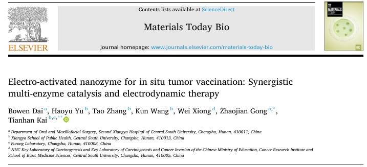 近日,湘雅二医院口腔医学中心龚朝建副教授,联合中南大学湘雅公共卫生学院开天瀚教授团队在《Materials today bio》(IF:10.2)杂志发表了题为“Electro-activated nanozyme for in situ tumor vaccination: Synergistic multi-enzyme catalysis and electrodynamic therapy”(电激活纳米酶用于原位肿瘤疫苗:协同多酶催化和电动力学治疗)的研究论文。该研究开发了一种多功能纳米酶平台(HMPR),该平台成功集成了电动力疗法、化学动力学疗法和免疫疗法。