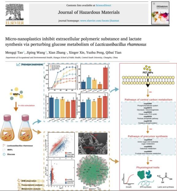 团队通过体外消化模拟与多组学联合技术,揭示经模拟消化的微纳塑料(尤其150 nm PET)通过抑制中心碳代谢通路中关键基因(galK、bglA等)与代谢物水平,阻断Lacticaseibacillus rhamnosus的葡萄糖代谢-产物合成轴,从代谢调控层面阐明胞外多聚物与乳酸合成受阻的分子机制。这一重要发现为评估微纳塑料对肠道益生菌的功能性损伤提供了理论依据,也为塑料污染物健康风险研究提供了新视角。