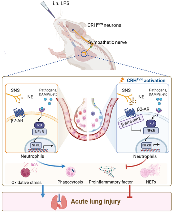 近日,中南大学湘雅二医院麻醉科戴茹萍教授、李卉副主任医师课题组在国际著名综合类期刊《自然通讯》(Nature Communications)以论著形式发表了题为《室旁核CRH神经元通过交感神经-中性粒细胞轴调节急性肺损伤(Paraventricularnucleus CRH neurons regulate acute lung injury via sympathetic nerve–neutrophil axis)的原创性论著。该研究在解析神经系统对急性肺损伤的调控机制方面取得了重要进展。