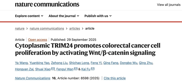 近日,中南大学湘雅医院精准分子医学研究所付凯特聘研究员团队在国际学术期刊《Nature Communications》(《自然通讯》,影响因子15.7)上在线发表题为《Cytoplasmic TRIM24 promotes colorectal cancer cell proliferation by activating Wnt/β-catenin signaling》(《细胞质分布的TRIM24通过激活Wnt/β-catenin信号通路促进结直肠癌细胞增殖》)的原创性研究成果。