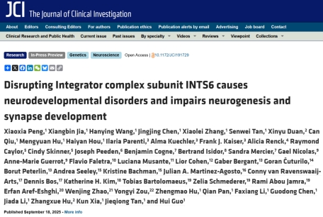 近日,生命科学学院郭辉课题组、谭洁琼课题组和南华大学/中南大学夏昆课题组,在国际权威期刊《临床研究杂志》(Journal of Clinical Investigation)在线发表题为“整合子亚基INTS6功能缺失导致神经发育障碍和神经发生及突触发育异常”(Disrupting Integrator complex subunit INTS6 causes neurodevelopmental disorders and impairs neurogenesis and synapse development)的研究论文。该成果首次明确整合子复合物亚基编码基因INTS6是神经发育关键调控基因,为神经发育障碍(NDD)精准诊疗与干预提供新方向。