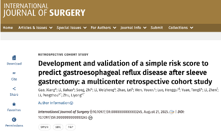 近日,中南大学湘雅三医院胃肠外科Ⅱ科(机器人及减重代谢外科)朱晒红、朱利勇教授团队牵头的多中心协作研究在国际权威期刊International Journal of Surgery(国际外科学杂志,JCR1区,10.1分)发表题为《Development and validation of a simple risk score to predict gastroesophageal reflux disease after sleeve gastrectomy: A multicenter retrospective cohort study》(预测袖状胃切除术后胃食管反流病的风险评分的开发和验证:一项多中心回顾性队列研究)的最新成果。
