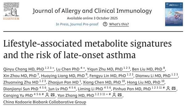 近日,中南大学湘雅医院呼吸与危重症医学科潘频华教授、张艳副教授与北京大学公共卫生学院余灿清教授团队合作,在过敏领域顶刊《The Journal of Allergy and Clinical Immunology》(《过敏和临床免疫学杂志》,IF:11.2)上在线发表原创研究成果“Lifestyle-associated metabolite signatures and the risk of late-onset asthma”(生活方式相关的代谢特征与晚发性哮喘的风险),揭示了生活方式影响的系统代谢信号改变对晚发型哮喘的预测作用。