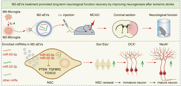 在《Journal of Nanobiotechnology》(中科院一区Top期刊,IF=12.6)杂志上发表题为“M2 microglia-derived small extracellular vesicles modulate NSC fate after ischemic stroke via miR-25-3p/miR-93-5p-TGFBR/PTEN/FOXO3 axis.”(M2型小胶质细胞来源的小细胞外囊泡通过miR-25-3p/miR-93-5p-TGFBR/PTEN/FOXO3轴调控缺血性脑卒中后神经干细胞命运)的原创性论著。该研究不仅揭示了小细胞外囊泡是M2-小胶质细胞调控神经干细胞介导神经再生的重要介质,还通过miRNA测序和miRNA抑制剂发现和验证了miR-25-3p/miR-93-5p-TGFBR/PTEN/FOXO3轴是发挥该作用的关键通路。该研究为细胞外囊泡精准治疗缺血性脑卒中提供了新的策略,或可突破当前脑卒中后神经再生不足的治疗瓶颈。