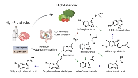 饮食与肠道微生物之间的相互作用是研究微生物和机体健康关系中的重要内容。尽管以往的研究发现不同饮食干预对肠道微生物组成和代谢物谱的影响,但对于饮食转变过程中肠道微生物群结构、功能潜能以及饮食变化下的微生物影响的代谢通路的具体变化仍不明确。本研究基于多组学整合分析,系统揭示了高蛋白饮食到高纤维饮食转变下肠道微生物群落结构和代谢通路的动态相应机制。结果显示,高蛋白饮食可显著降低菌群多样性并扰乱代谢稳态,而高纤维饮食可有效恢复微生态平衡,促进与健康相关的色氨酸及糖代谢通路活化。研究还发现,Akkermansia muciniphila与Faecalibaculum rodentium为这一过程中的关键响应菌种,在饮食调节与代谢重塑中发挥重要作用。该成果为阐明“饮食—微生物—代谢”相互作用机制提供了新思路,对个体化营养干预与代谢性疾病防控具有重要科学意义。