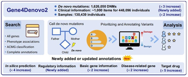 在《Nucleic Acids Research》(《核酸研究》,IF=13.1)上发表题为“Gene4Denovo2: an updated platform for human de novo mutations discovery and interpretation”(Gene4Denovo2:全面整合新发变异的数据库及分析平台)原创性论著。新发变异(DNMs)是指在后代中出现,但在父母中未检测到的变异,通常产生于生殖细胞或受精后不久。研究表明,新发变异在神经精神疾病的发生发展过程中起重要作用。由于能够逃避进化选择压力,新发变异往往具有显著的功能破坏潜力;此外,它们还为那些无法通过遗传变异解释病因的散发病例提供了关键的临床证据。多次出现的新发变异,尤其是功能缺失性变异和有害错义变异,已经推动了大量与神经精神疾病相关的高置信风险基因的发现。该工作在团队此前发布的Gene4Denovo平台基础上进行了重大升级,旨在提供更全面的新发变异数据集及其解读功能。Gene4Denovo2提供了更大规模的新发变异数据集、更丰富的注释体系以及更强的分析能力,将有助于深入揭示新发变异在神经精神疾病中的致病机制,同时为ACMG中PS2/PM6条款提供了丰富的数据资源。