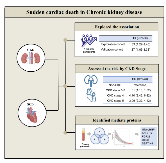 在各类心血管事件中,心源性猝死因高致死率而尤为突出,约20%的晚期CKD患者死于该病因。目前,针对不同分期CKD患者的心源性猝死风险研究仍较为有限。本研究基于中国本土纵向队列、国际前瞻性队列及蛋白组学数据,首次系统揭示CKD患者长期心源性猝死风险显著增加,且随疾病进展逐步上升。通过多队列蛋白组学分析,筛选出NT-proBNP与FGF23作为潜在生物标志物。研究强调,对CKD患者的临床管理除延缓肾功能进展外,还应将定期心电图监测等综合策略纳入常规管理,以降低心血管风险。该成果是继2023、2024年课题组阐明癫痫所致心律失常后,在心脏重大疾病研究领域的又一系统性突破。