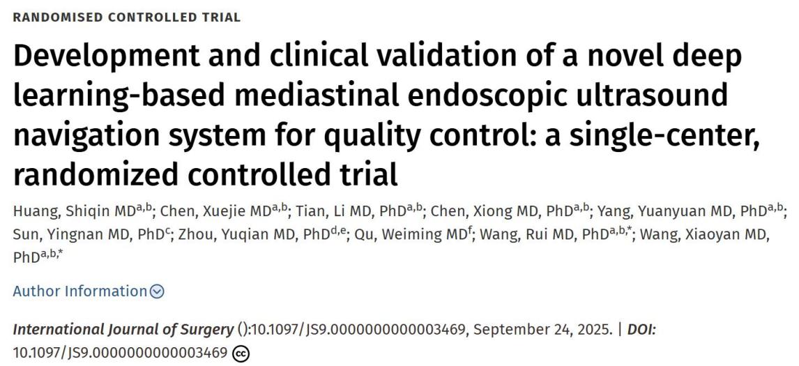近日,中南大学湘雅三医院消化内科王晓艳教授、王瑞副研究员以共同通讯作者在国际外科学权威期刊《国际外科学杂志》(International Journal of Surgery,JCR1区,IF=10.1) 发表原创性研究论文《基于深度学习的全新纵隔超声内镜导航系统在质量控制中的开发与临床验证:一项单中心随机对照试验(Development and clinical validation of a novel deep learning-based mediastinal endoscopic ultrasound navigation system for quality control: a single-center, randomized controlled trial)》。