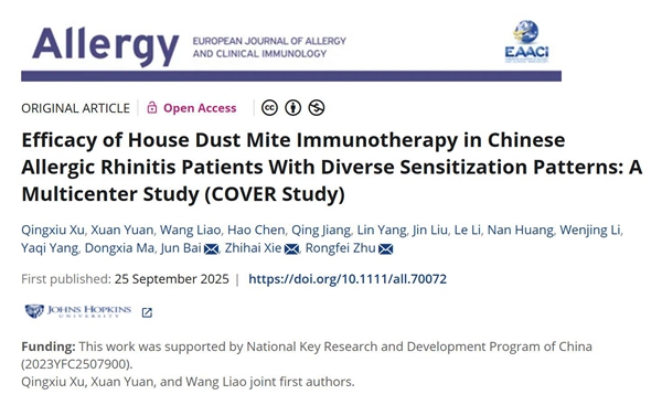 近日,中南大学湘雅医院耳鼻咽喉头颈外科谢志海教授团队与华中科技大学同济医学院附属同济医院过敏反应科祝戎飞教授团队、佛山市妇幼保健院儿科白珺教授团队合作,在过敏领域顶刊《Allergy》(《过敏》,IF:12.0)上在线发表原创研究成果“Efficacy of House Dust Mite Immunotherapy in Chinese Allergic Rhinitis Patients With Diverse Sensitization Patterns: A Multicenter Study(COVER Study)”(尘螨免疫治疗中国不同致敏模式过敏性鼻炎患者的疗效观察:一项多中心研究)。该研究揭示了尘螨(HDM)致敏模式影响皮下免疫治疗的结局,其中HDM主要和次要组分均致敏的过敏性鼻炎患者在接受HDM提取物(Allergopharma)皮下免疫治疗时疗效更佳。