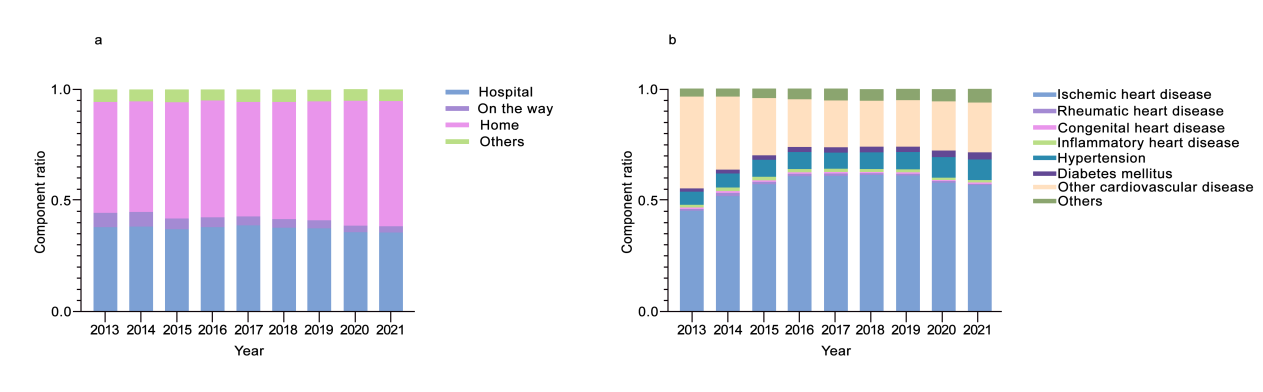 心源性猝死发病突然、其死亡率超过90%,对公众生命健康构成重大威胁,然而长期以来我国缺乏全国层面的系统数据支撑防控工作。针对这一研究空白,陆瑶教授进一步与中国CDC慢病中心周脉耕主任团队合作,首次基于2013-2021年全国死亡监测数据系统揭示我国心源性猝死的疾病负担。结果显示我国心源性猝死呈持续加重趋势,年龄标准化死亡率从10.95/10万增至18.38/10万,其中男性发生率为女性1.7–1.8倍,65岁以上老年人风险显著增高。研究指出约60%的心源性猝死与缺血性心脏病相关,且超过半数病例发生于院外,凸显我国在一级预防、高危人群早期干预及院外急救体系方面存在短板,亟需通过加强AED配置、普及CPR培训并优化应急响应机制以应对日益加重的疾病负担。