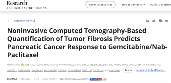 龚学军教授、李宜雄教授团队联合中山大学肿瘤防治中心及深圳大学等多家机构,在《Science》的合作期刊《Research(研究)》(IF=10.7)在线发表了题为《Noninvasive Computed Tomography-Based Quantification of Tumor Fibrosis Predicts Pancreatic Cancer Response to Gemcitabine/Nab-Paclitaxel(基于无创性计算机断层扫描的肿瘤纤维化定量预测胰腺癌对吉西他滨/紫杉醇的反应)》的研究成果。该研究首次开发并验证了一种基于常规增强CT影像的肿瘤纤维化无创量化模型,可精准预测不可切除胰腺癌患者对一线化疗方案AG(吉西他滨+白蛋白紫杉醇)的疗效,为胰腺癌个体化治疗提供了全新、无创、可推广的影像生物标志物。