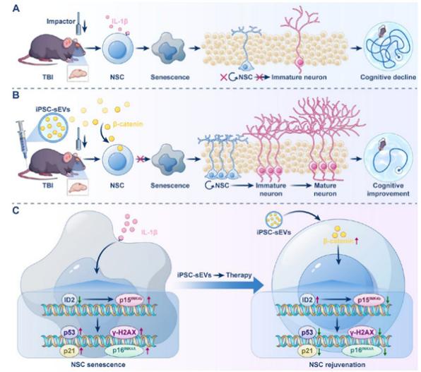 在《ACS nano》(中科院一区Top期刊,IF=16.0)杂志上发表题为“Induced Pluripotent Stem Cell-Derived Extracellular Vesicles Prevent Neural Stem Cell Senescence to Promote Cognitive Recovery after Traumatic Brain Injury.”(诱导分化多能干细胞来源小细胞外囊泡防治神经干细胞衰老,促进创伤性脑损伤后的认知功能恢复)的原创性论著。这项研究揭示了TBI后持续的认知障碍与海马神经干细胞(H-NSCs)衰老密切相关;TBI后长期上调的促炎因子IL-1β是导致H-NSCs衰老的关键因素;诱导分化多能干细胞来源的细胞外囊泡(iPSC-sEVs)通过β-catenin/ID2/CDKN2B(p15INK4b)轴以抑制H-NSC衰老并改善TBI后的认知功能,为TBI患者认知功能恢复提供了新的策略。