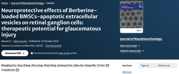 近日,中南大学湘雅医院眼科中心及眼科学湖南省重点实验室夏晓波教授团队在《Journal of Nanobiotechnology》(《纳米生物技术》,23, 646 (2025). https://doi.org/10.1186/s12951-025-03714-2,中科院一区,IF:12.6)发表题为“Neuroprotective Effects of Berberine-loaded BMSCs-Apoptotic Extracellular Vesicles on Retinal Ganglion Cells: Therapeutic Potential for Glaucomatous Injury”(负载小檗碱的骨髓间充质干细胞凋亡细胞外囊泡对视网膜神经节细胞的神经保护作用:青光眼损伤的治疗潜力)的研究论文。该研究发现骨髓间充质干细胞来源的凋亡囊泡在青光眼缺血再灌注模型中可抗炎、促视网膜神经节细胞存活并保护视觉功能,且能下调炎症基因Irgm1(免疫相关GTP酶家族成员1(Immunity Related GTPase M1))。同时建立新型药物递送策略,将小檗碱负载到凋亡囊泡上,进一步增强对视网膜神经节细胞的保护作用,实现炎症协同抑制与神经元活力提升。并且明确该保护效应通过Irgm1抑制MAPK(丝裂原活化蛋白激酶(Mitogen-Activated Protein Kinase)) 信号通路介导,且首次证实Irgm1是青光眼潜在治疗靶点,为青光眼治疗提供新方向。