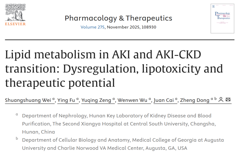 近日,中南大学湘雅二医院肾内科董政教授团队,在国际药学领域权威期刊《Pharmacology & Therapeutics》(IF: 12.5,中科院一区)上发表了题为“Lipid metabolism in AKI and AKI-CKD transition: Dysregulation, lipotoxicity and therapeutic potential”的综述。从脂质代谢紊乱的视角,全面解析了急性肾损伤(AKI)发生发展及向慢性肾脏病(CKD)转化的核心机制,明确脂毒性在肾损伤进展中的关键作用,并提出靶向脂质代谢的潜在治疗策略。