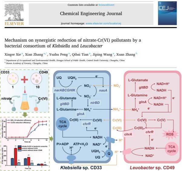 突破单菌功能局限,团队通过构建合成菌群(Klebsiella sp. CD33与Leucobacter sp. CD49),阐明了其通过代谢互补与电子分配以协同去除硝酸盐与Cr(VI)的分子机制。该体系中,CD33利用氮代谢为合成菌群生长提供了氮源支持,CD49则通过特异的Cr(VI)还原缓解毒性胁迫,从而实现复合污染物的高效协同去除。本研究为复合污染的高效生物防治提供了理论支撑与技术指导。