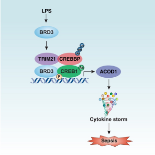 脓毒症以宿主对病原体感染的固有免疫应答失调为特征,致死率极高,构成重大公共卫生挑战,其免疫代谢调控机制尚未被充分阐明。本研究首次明确,含溴域蛋白3(BRD3)通过非经典途径上调单核细胞与巨噬细胞中乌头酸脱羧酶1(ACOD1)的表达,在感染性休克中发挥关键作用。机制上,脂多糖(LPS)可触发BRD3与三联基序蛋白21(TRIM21)相互作用;TRIM21借助其E3泛素连接酶活性激活CREB结合蛋白(CREBBP),促进CREBBP与环磷酸腺苷反应元件结合蛋白1(CREB1)的结合及乙酰化修饰;随后BRD3识别并磷酸化乙酰化CREB1的转录激活位点,最终驱动ACOD1基因转录上调。在四种小鼠感染模型中,骨髓细胞特异性Brd3基因敲除(Brd3Mye⁻/⁻)或采用小分子抑制剂OTX015进行干预,均能显著减轻全身炎症反应及器官损伤,其保护效应与ACOD1骨髓细胞特异性敲除(Acod1Mye⁻/⁻)小鼠一致。临床数据进一步证实,脓毒症患者外周血中BRD3水平升高与炎症反应加剧、疾病严重程度增加及院内死亡风险升高直接相关,明确BRD3可作为感染相关免疫失调的潜在治疗靶点。