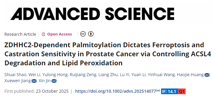 金鑫团队《Advanced Science》发文揭示ZDHHC2-USP19-ACSL4轴调控前列腺癌恩杂鲁胺耐药机制