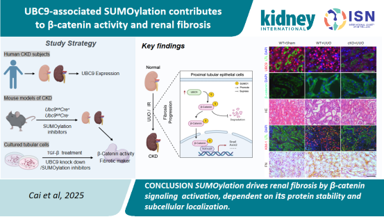 近日,中南大学湘雅二医院肾脏病研究所、肾内科董政/蔡娟团队在国际肾脏病学会会刊Kidney International(IF=12.6)上发表了原创论文“UBC9-associated SUMOylation contributes toβ-catenin activation and kidney fibrosis”,创新性揭示了SUMO(Small Ubiquitin-like Modifier)修饰关键酶UBC9在肾间质纤维化中的核心作用,为有效延缓慢性肾脏病进展提供了全新的干预靶点。