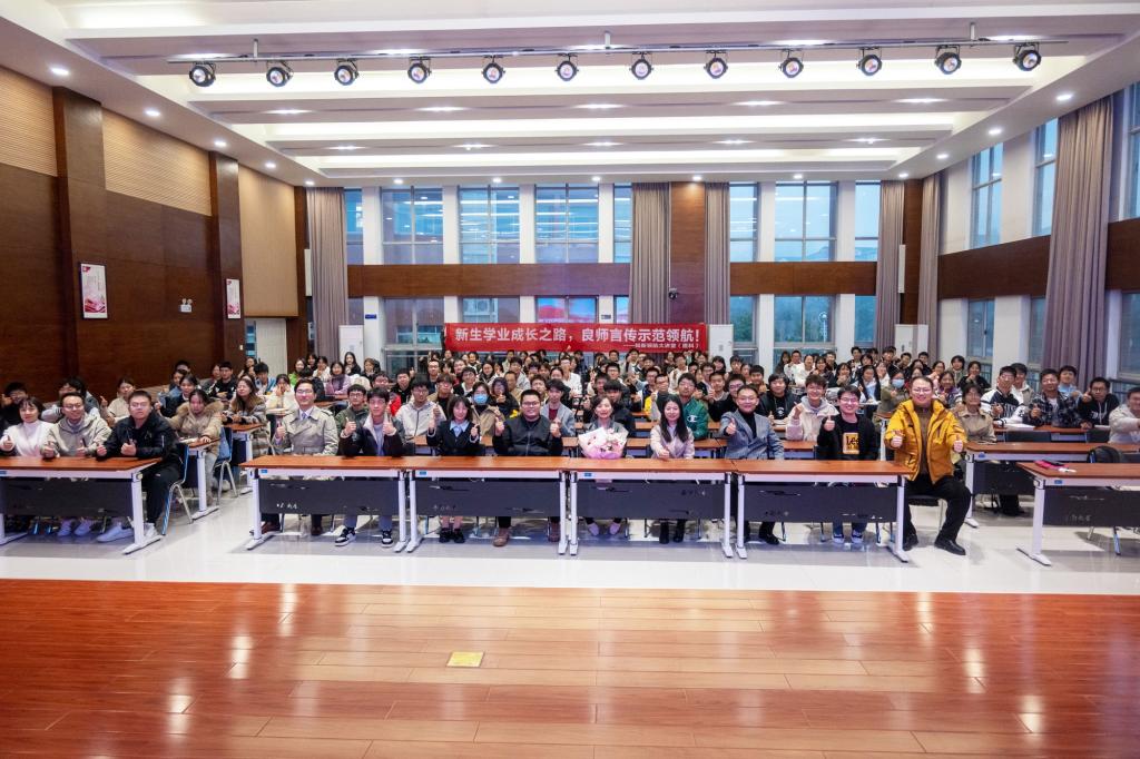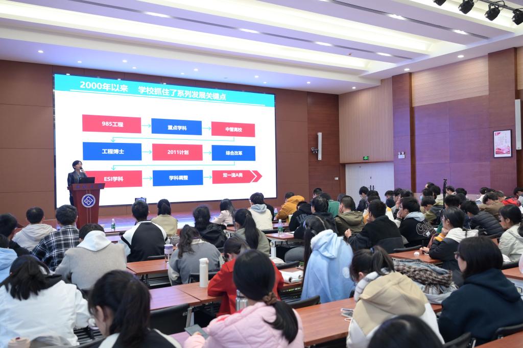 武明花教授向大家展示了学校目前一流学科建设的进展及成效,并做出总结:学校抓住了每一次重大发展机遇,勇担使命,贡献一流,成效显著。她鼓励学生们要勇于创新,多关注国内外大事,从入学就要树立长远目标,努力向目标迈进。