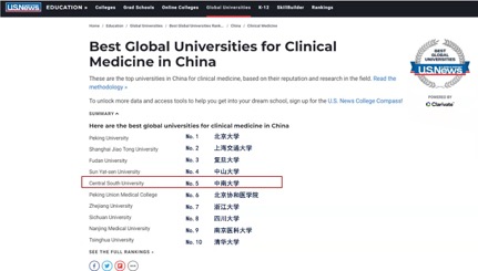近日,U.S.News世界大学排名发布了中国高校临床医学排行榜,中南大学临床医学排名中国第5位。
