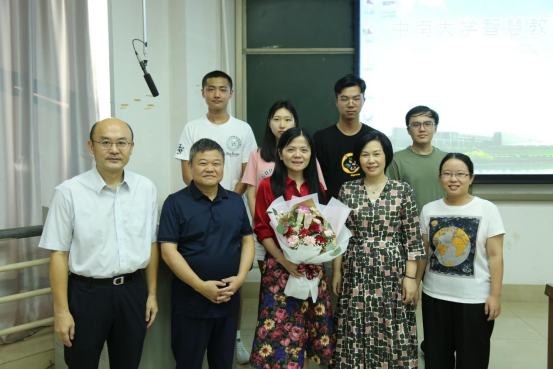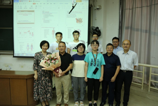 在福庆楼T208教室,基础医学院人体解剖学与神经生物学系教授潘爱华正在等待来上课的学生。“教师节快乐!”吴晓创、丁建农、陈俊香三位副院长手捧鲜花,笑容满面地走进教室,对潘爱华老师进行亲切慰问。随后医学院领导到访T211、T212等教室,为基础医学院人体解剖学与神经生物学系副教授卢大华、湘雅三医院血液内科教授李昕等老师献花送祝福。