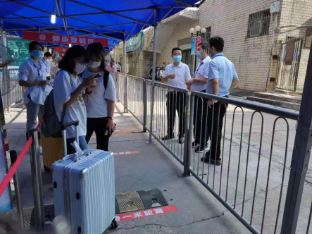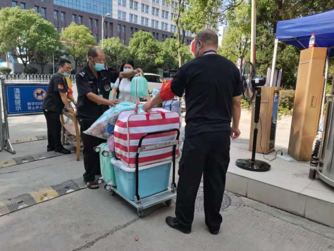 在湘雅医学院新校区体育馆侧南二门处,湘雅新校区接待站工作人员早早就位。接待服务站下设指挥调度组、身份确认组、温度测量组、保卫疏导组、医疗保障组。学生按照“一验二测三检四扫”的程序,有序进入校园。入住宿舍时,楼栋服务组进行指导,并再次测量体温。物业人员驾驶“爱心服务车”、推小拖车为学生托运行李,后勤人员准备充足的防疫物资及后勤物资,保证返校工作的有序开展。第一批返校接待站共安排7班、64位工作人员参与协调岗、安保岗、测温岗、身份岗、休息区、隔离区等岗位,确保两天内无间断值班,做到以服务学生为本,最大化为学生提供方便。