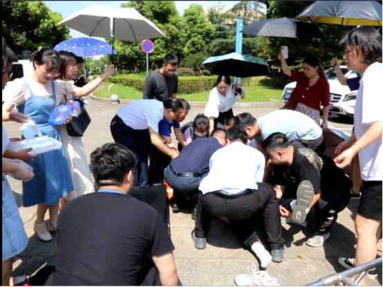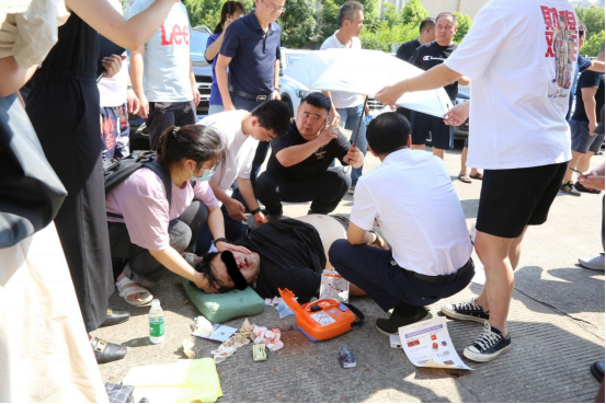 发现有异常情况的师生们聚集起来,有人主动替换姜燕给病人做心肺复苏,有人拿来了日常配备用于应急的AED设备,有人负责观察病人面色,有人负责清理口鼻异物,将病人的舌头拉出来以维持呼吸道畅通,有人撑着伞给病人遮住毒辣的阳光……湘雅医学院党委书记常实、常务副院长柴湘平、副院长段绍斌等人听闻情况,放下手中事务,以最快速度跑到现场,一边致电邻近的湘雅三医院,一边组织指导完成接下来的急救工作及后续转运抢救工作。