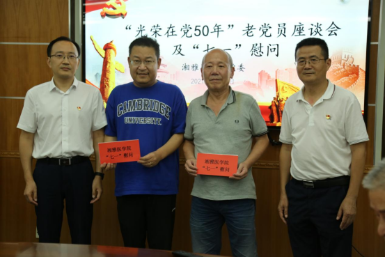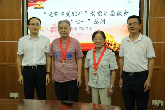 会上,湘雅医学院党委书记常实、常务副院长柴湘平为“光荣在党50年”老党员胡盛明、王爱珍颁发“光荣在党50年”纪念章。