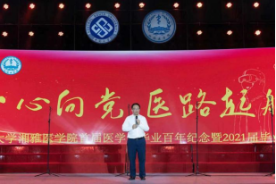 2021年6月20日晚7点,“一心向党,医路起航”谈球吧首届医学生毕业百年纪念暨2021届毕业晚会顺利举行。中南大学副校长、湘雅医学院院长陈翔,中南大学副校长陈立章,学校各职能部门领导、湘雅医学院领导班子,医口各二级学院党委书记、院长,附属医院党委书记、院长、教学副院长,医学检验系、麻醉医学系、精神卫生系主任,2021届毕业生们到场参加。