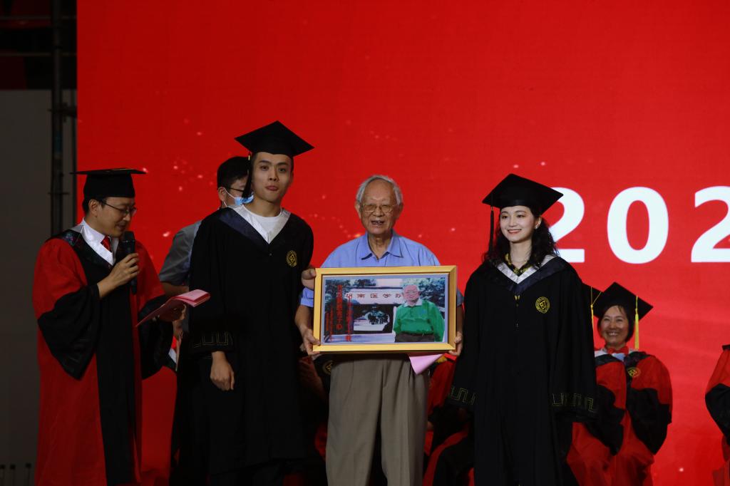 “作为一个90岁的老人,作为一个有67年党龄的老党员,这些年来,看到国家突飞猛进的进步,看到人民的生活不断提高,看到我们学校不断的发展,感到非常高兴。”1956届毕业生代表彭隆祥教授深情回忆了1951年进入湘雅后五年的学习生涯,分享了同学去往全国各地作出贡献的不同经历,并且告诉毕业生,“人生的道路是很漫长的,人生的机会也是各种各样的,希望大家在人生的道路上奋发有为,做出很好的成绩,不是说人人都能成为有名的院士,但是应该做一个受人们尊敬的医护工作者,应该成为一个不愧湘雅人称号的人。”为表达对彭隆祥教授的敬意,学生们为彭老送上亲手绘制的纪念画像。