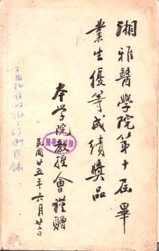 按照谭世杰、萧子溪的姓名等线索,经查湘雅自创办以来,曾任学院文书办主任、注册组主任、学监等职的胡荣琦老先生所著的《湘雅医学院二十五年大事表》得知:“民国二十四年七月,技术生毕业四人,计化验班冯俟、朱琼、杨赞元三人,制药班季长宜一人。按:本院技术生系照各部之需要,随时招取,三年毕业,有教学之课程,无学校之形式,自医学继续开办后,发有证书者如俞纯虎、谭世杰、萧子溪、黄开桓、王邦直、李云松、刘泽厚之习制药,张崇芩、叶立权、柳果哉之化验,皆本院技术毕业生也。最早尚有宋尚道、唐邦、尹大本、汤松涛、王启勋之习细菌与化验,何鉴清、何子匡、何伯藩之习制药,惜缺纪录,佚名必多。”这一记载说明了湘雅医学院培养技术生的办学形式,所有已毕业的名单,惜缺纪录,佚名必多。自医学继续开办后,习制药的技术生发有证书者有谭世杰、萧子溪等7人。谭、萧两人系湘雅同学。《湘雅医学院二十五年大事表》还载明:“民国廿五年六月廿二日,举行第十届毕业,并授予医学士学位典礼。第十届毕业生计田运干、吕静轩、朱保仁、林筱周、唐文铭、刘彦勋、潘绍周、刘谷孙、凌惠扬、谢陶瀛、谭世杰十一人。刘谷孙成绩第一,谭世杰论文第一。”故此,有湘雅医学院授予谭世杰的奖品(见图4、5)。