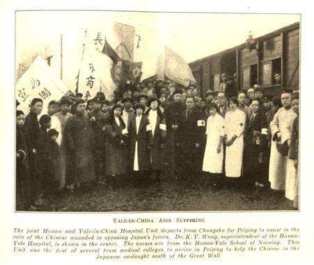 这幅图是耶鲁校友周刊1933年5月3日的报道。该图与1933年2月18日《天津益世报》第二版 “湘雅医院组织东北救护队,王光宇任队长出发北上,设立野战医院实施救援”的报道所指的事实一致。是湘省人民抗日会、长沙市商会、学生抗日会暨艺芳、圣功以及雅礼、湘雅各校校董及各校学生2000余人,于小吴门外火车站,欢送他们的场景。图中第一排左起第四、五两位是女护士彭文亮与丁绶梅,第六位是王子玕,二排左起第三是肖元定,第五是齐镇垣。该照为王子玕的后人与大李先生共同提供。