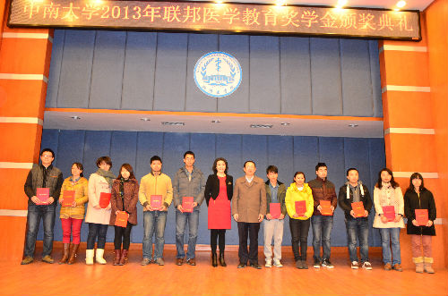 12月27日,在湘雅医学院新校区四楼学术报告厅,我校党委副书记陶立坚、联邦制药国际控股有限公司(简称“联邦制药公司”)副总裁邹鲜红及副总经理刘晶、研究生院培养办主任陈立章等为48名获得2013年度联邦医学教育奖学金的学子颁奖。颁奖典礼由本科生副院长邬力祥主持。