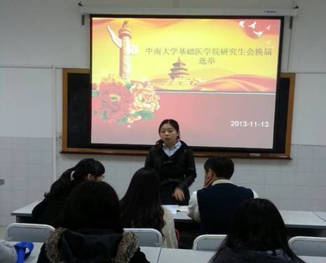 2013年11月14日下午4点,基础医学院2013年研究生会换届选举大会在后栋325教室举行。本次大会由基础医学院研究生会主席马璇主持,研究生会全体成员参加了会议。
