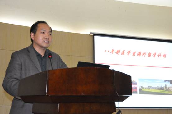 副院长张欣、何庆南介绍近年我校八年制学生赴国外学习交流项目情况。张欣首先向同学们介绍近年学生赴外学习交流总体情况,他说在张校长的高度重视下,通过这几年学校的不懈努力,这一交流计划得以顺利进行,达到了预期目的。今后学校还要通过这一短期和长期两个交流项目,增加选派名额,每年选派50名八年制医学生到国外一流大学学习。目前学校已与耶鲁大学、康奈尔大学、南加州大学、Flinders大学、匹兹堡大学、渥太华大学以及香港科技大学等世界一流大学签定协议。