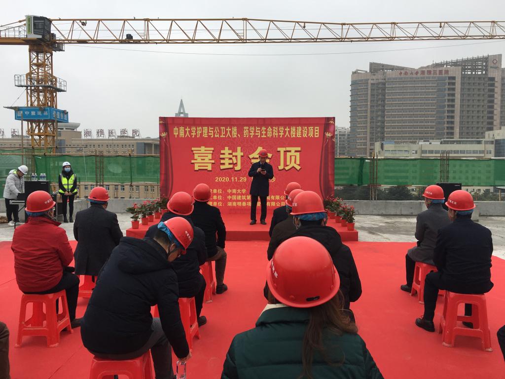 11月29日上午10点30分,中南大学护理与公卫、药学与生命科学大楼封顶仪式在湘雅新校区护理与公卫大楼楼顶隆重举行。中南大学副校长、湘雅医学院院长陈翔,副校长陈立章,基建处处长王海东,教育基金会秘书长张忠生,湘雅医学院党委书记黎志宏以及湘雅校区各二级学院负责人,施工、监理、全过程咨询单位负责人等出席大楼封顶仪式。黎志宏主持封顶仪式。