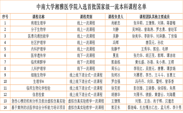 根据《教育部关于一流本科课程建设的实施意见》(教高〔2019〕8号)等有关文件要求,经各省级教育行政部门和高校申报推荐,教育部于2020年10月30日公示评审拟认定的3560门课程为首批国家级一流本科课程。中南大学总计有38门课程入选,位居全国第八名。其中医学类课程14门被选中,位居全国医学院校第2位,包括线上一流课程5门、线下一流课程3门、线上线下混合式一流课程4门、虚拟仿真实验教学一流课程2门。具体课程如下: